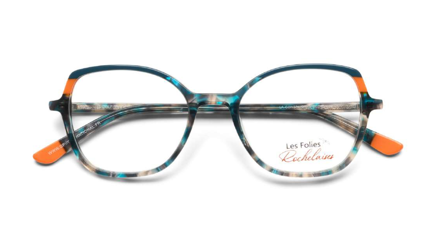 Les Folies Rochelaises : une monture femme de caractère signée GP International. Design audacieux en acétate italien pour opticiens créatifs.