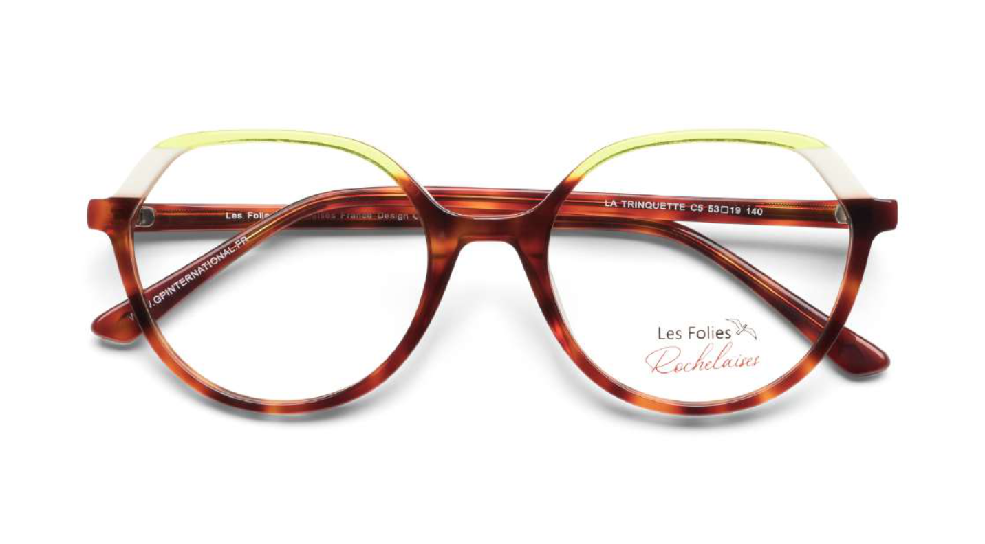 Les Folies Rochelaises : une monture femme de caractère signée GP International. Design audacieux en acétate italien pour opticiens créatifs.